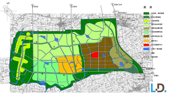 整個園區分為"一心五區"六個組成部分,即位于園區中部的管理中心,分布在管理中心周邊的現代農業加工區、國際農業展示區、現代農業示范 區、農業科技孵化區和農業休閑區。